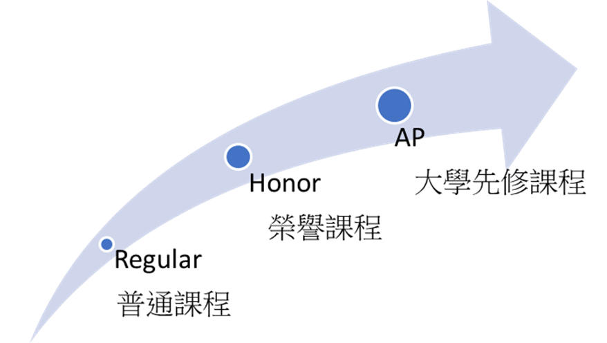 就像玩遊戲闖關一樣,美高課程從最基礎的普通課程,到榮譽課程,再來才是大學先修課程。從簡單到困難,一關接著一關的。