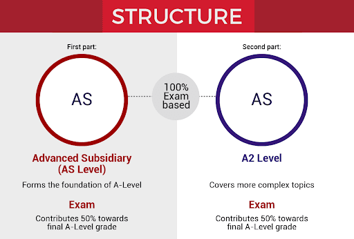 學制為 2 年,第一年為 Advanced Subsidiary (AS),學生可以選擇自己喜歡的 3-4 門的課程學習;第二年為 A2,學生可以放棄一門在AS學習上不太好的科目,最終獲得 3 門 A-Level 的考試成績。兩年考試都通過即可取得文憑,申請大學。